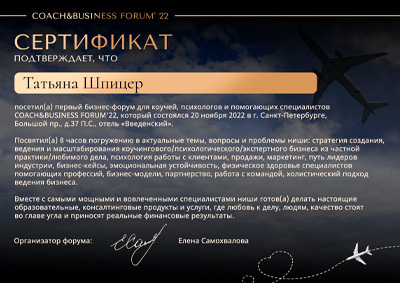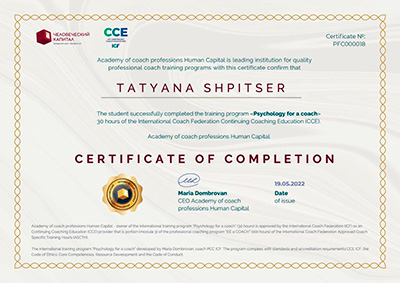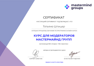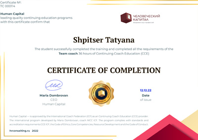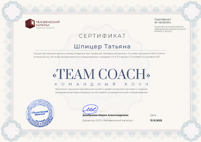 Вся команда детского языкового центра Умная Среда в лице руководителя Кобозовой Юлии Александровны выражает огромную благодарность в проведении командной коуч сессии Шпицер Татьяне. Запрос был от лидера команды на сплочение и постановку общих целей, создание безопасной среды для открытого диалога. Для нашей команды это был первый опыт, спасибо Татьяне за атмосферу доверия как в онлайн так и офлайн встречах и сессиях. Нам было страшно начинать, так как поднимаются скрытые и глубинные проблемы, раскрыв, которые уже нельзя свернуть назад, но с поддержкой Татьяны мы смогли начать!! Благодарю за профессионализм, эмпатию и реальную помощь.